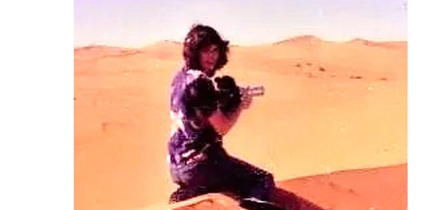 This is Judith Marie on top of a sand dune in Dhahran, Saudi Arabia, shooting camels